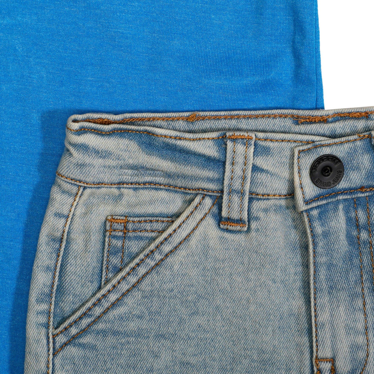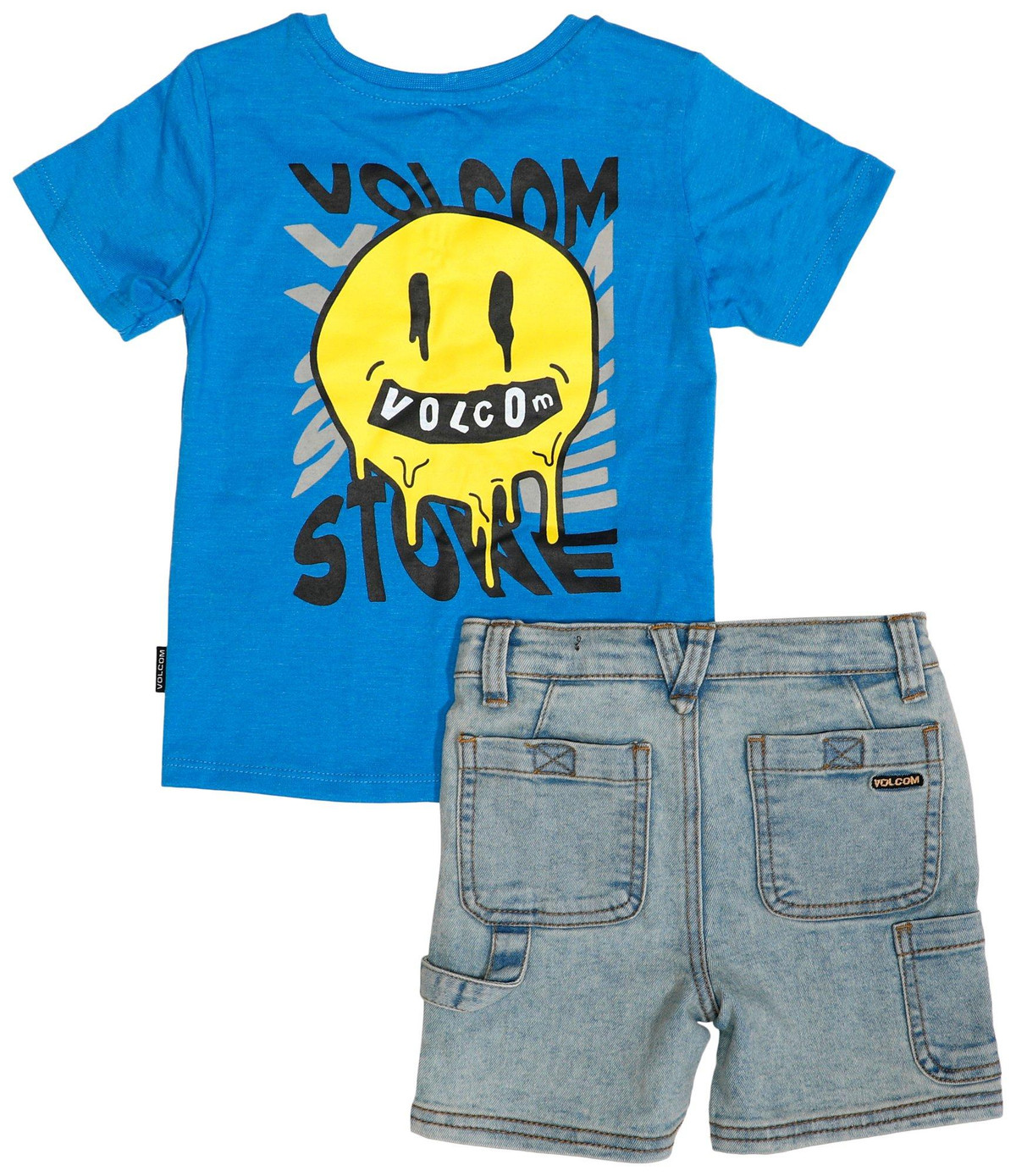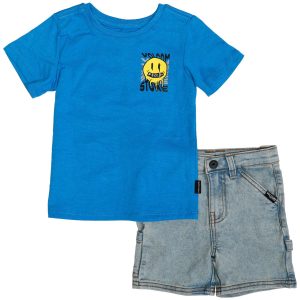 This Volcom two piece set combines casual style with everyday comfort. The blue crew neck t shirt features a classic fit with a playful smiley face on the back for a fun touch. Paired with denim shorts designed with five pockets including a coin pocket and utility pocket this set offers both function and fashion. Perfect for active days and laid back outings it keeps little ones looking cool and feeling great all day long.