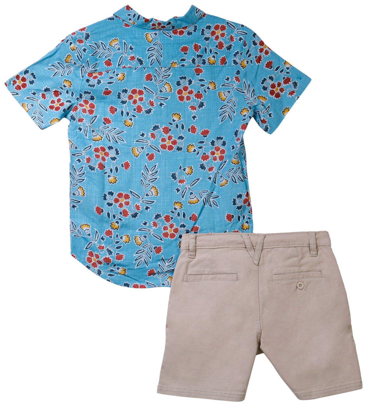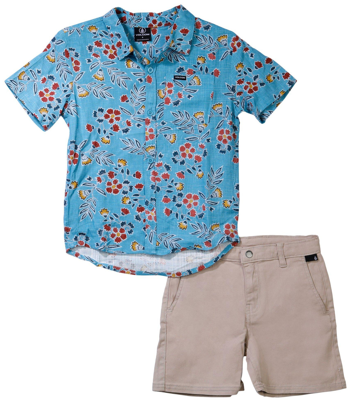 The Volcom Boys Chino Woven Set combines style and comfort for any occasion. The blue button-down top features subtle flower accents in copper and yellow, adding a touch of laid-back charm. Paired with khaki light brown shorts, this set offers a classic look with practical details, including four pockets and a secure buttoned back pocket. With a 3 1/2-inch inseam, these shorts provide the perfect fit for all-day wear.