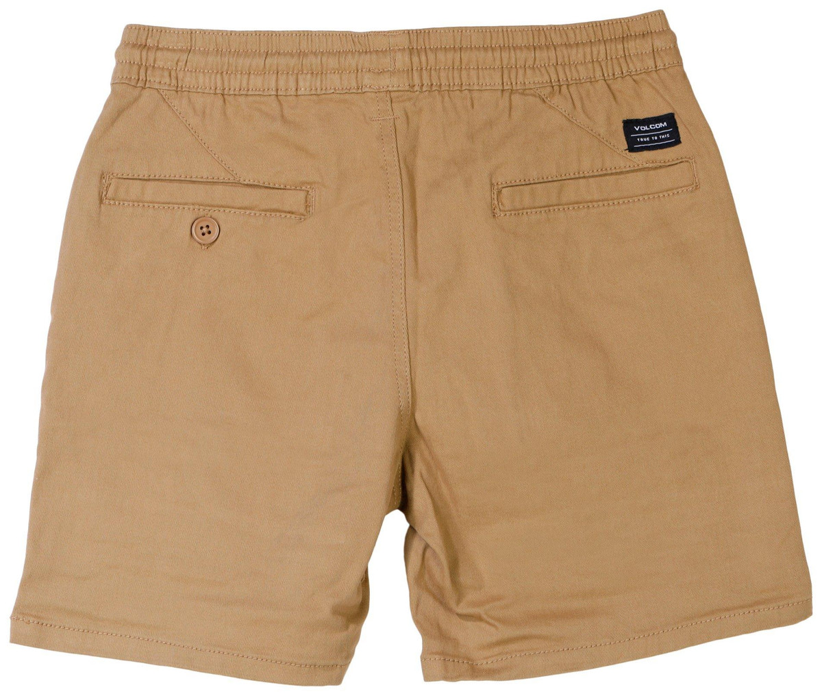 The Boys Khaki Shorts by Volcom feature an elastic drawstring waistband, flat front, and signature asymmetric back yoke for standout style. Designed with 2 side pockets, 1 back pocket, and 1 welt pocket with woven label. Made from cotton, recycled polyester, elastane, and stretch twill for comfort and flexibility. 13 inch outseam. Machine wash and tumble dry.