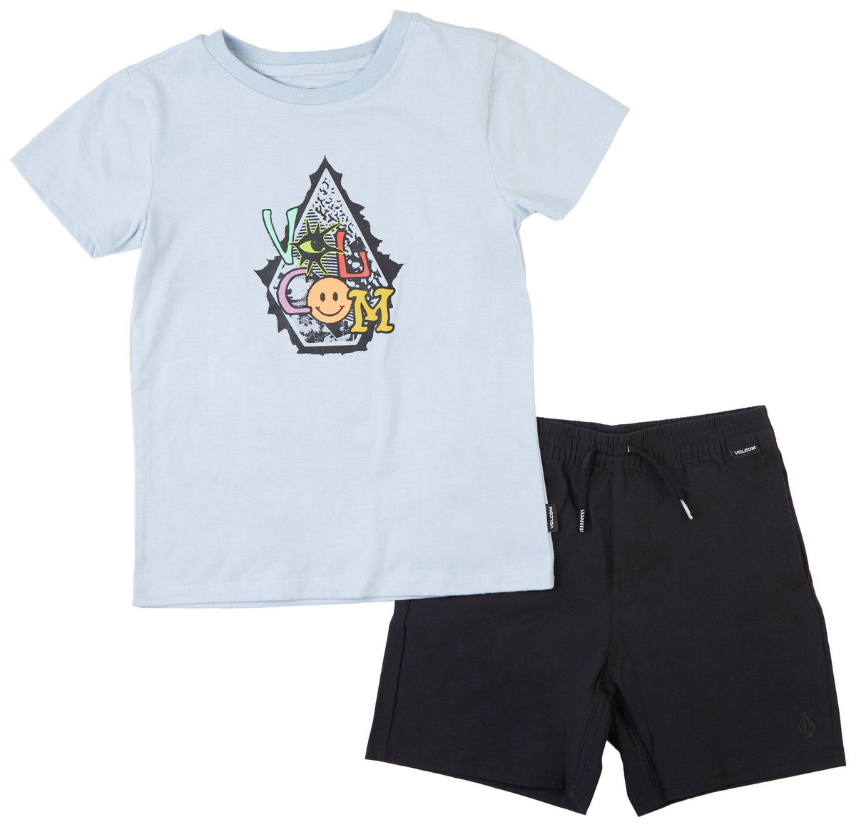 The Little Boys 2 Piece Shorts Set includes a fun short sleeve graphic shirt paired with easy pull on shorts. This casual combo is perfect for active days, offering comfort and playful style for everyday adventures.