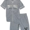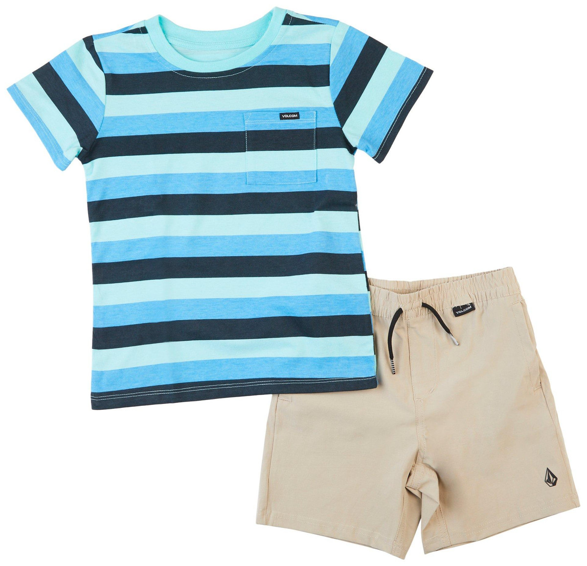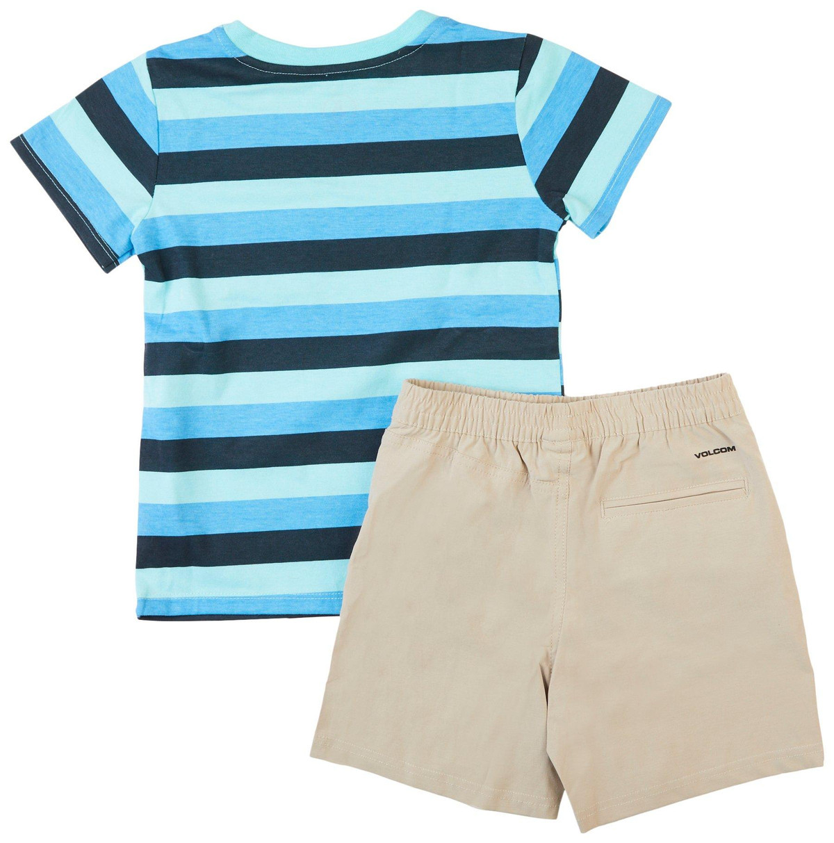The Little Boys 2 Piece Shorts Set includes a soft short sleeve striped shirt paired with easy pull on shorts featuring a comfy drawstring waist. This playful and practical outfit is perfect for warm days filled with fun and movement.