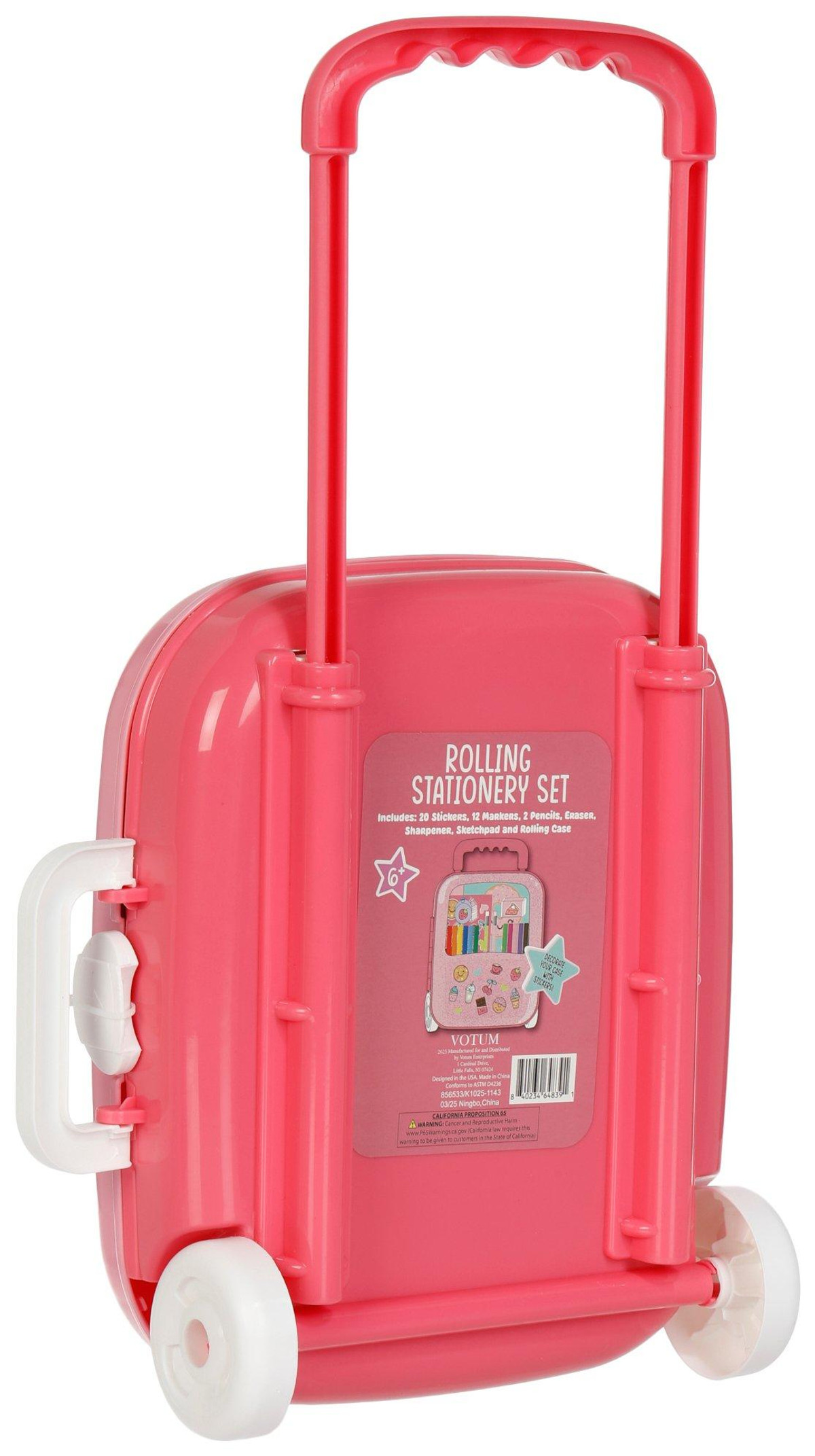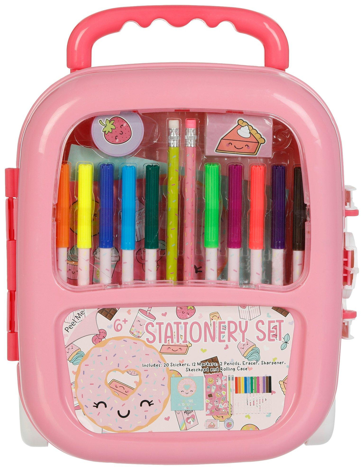 Inspire creativity on the go with this Girls Pink Bag Rolling Stationery Set, featuring a roller case filled with 20 stickers, 12 markers, 2 pencils, eraser, sharpener, and a sketchpad. Designed for easy transport and organized fun. Suitable for ages 6 years+.