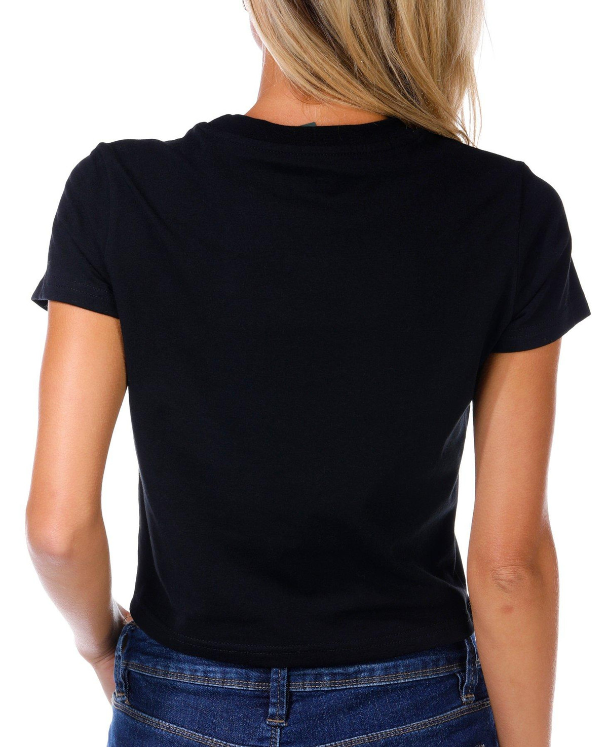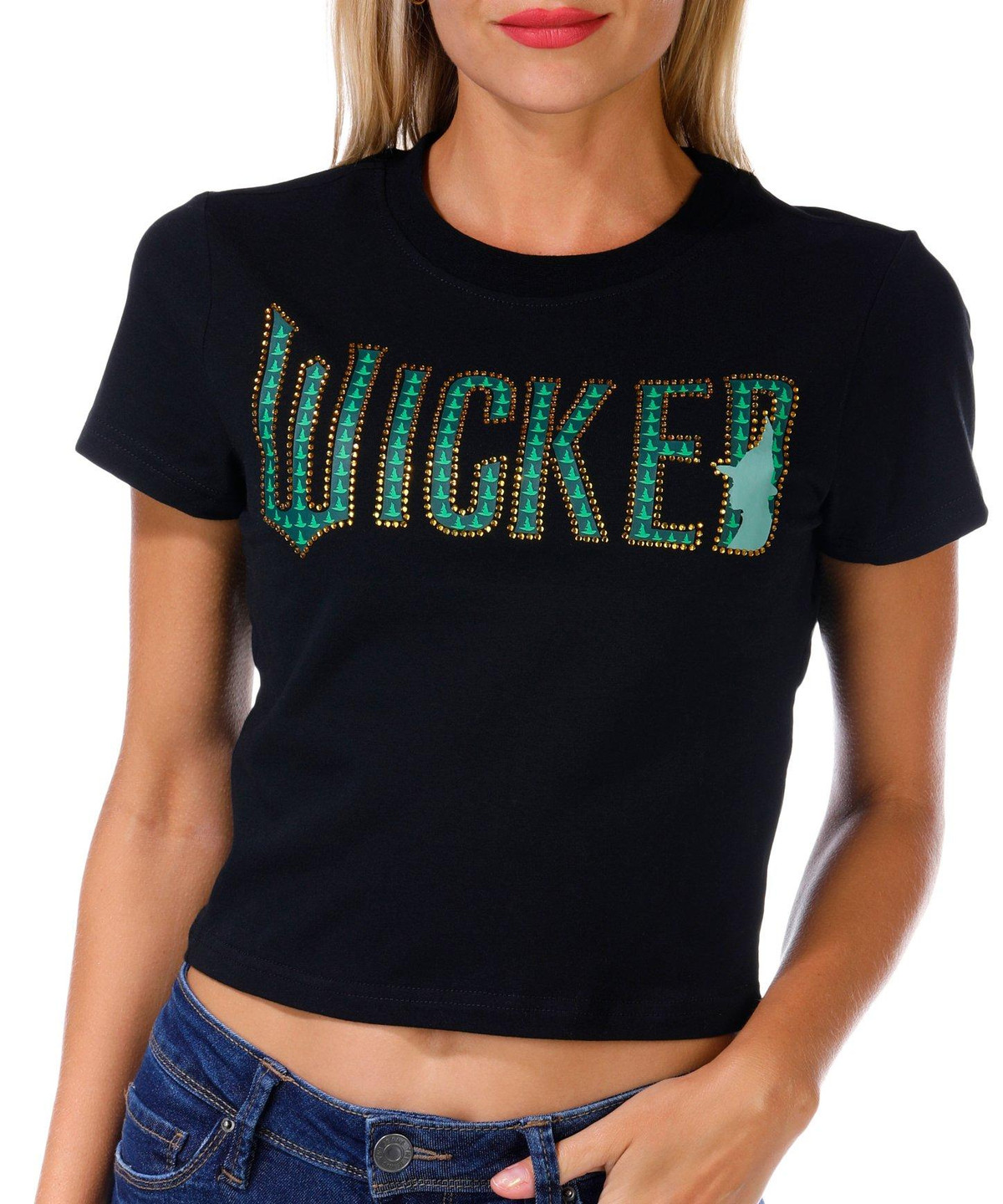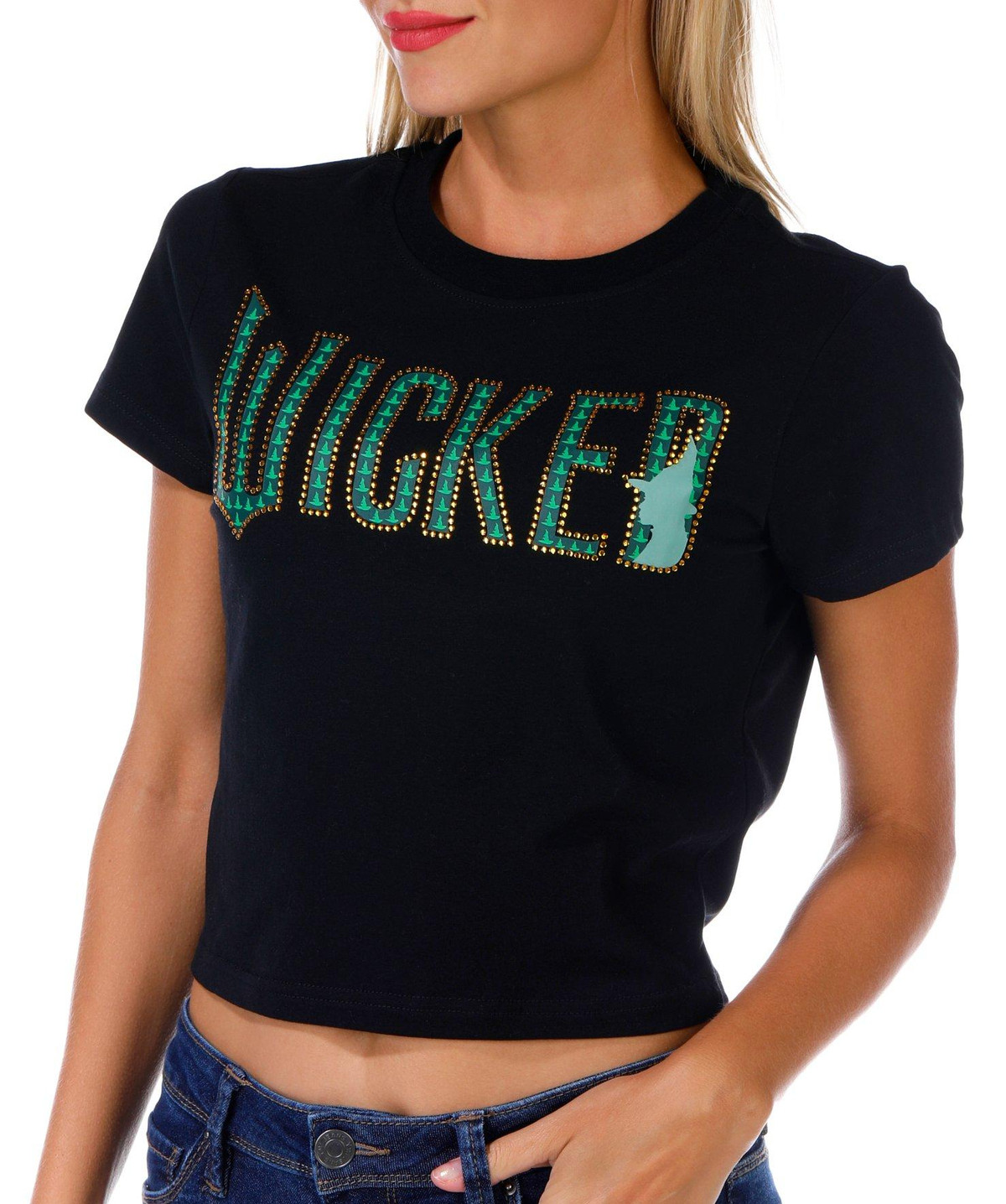 This juniors baby tee features a classic crew neckline and short sleeves with a bold embellished Wicked script across the front. A fun and edgy piece that adds personality to any casual outfit. Fabrication 95% cotton, 5% spandex