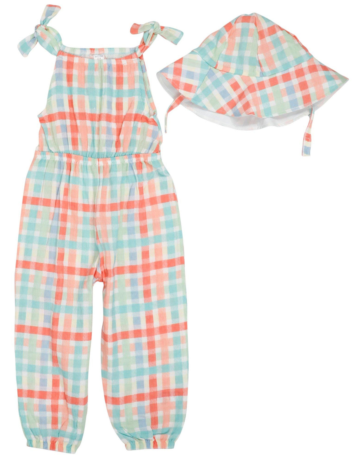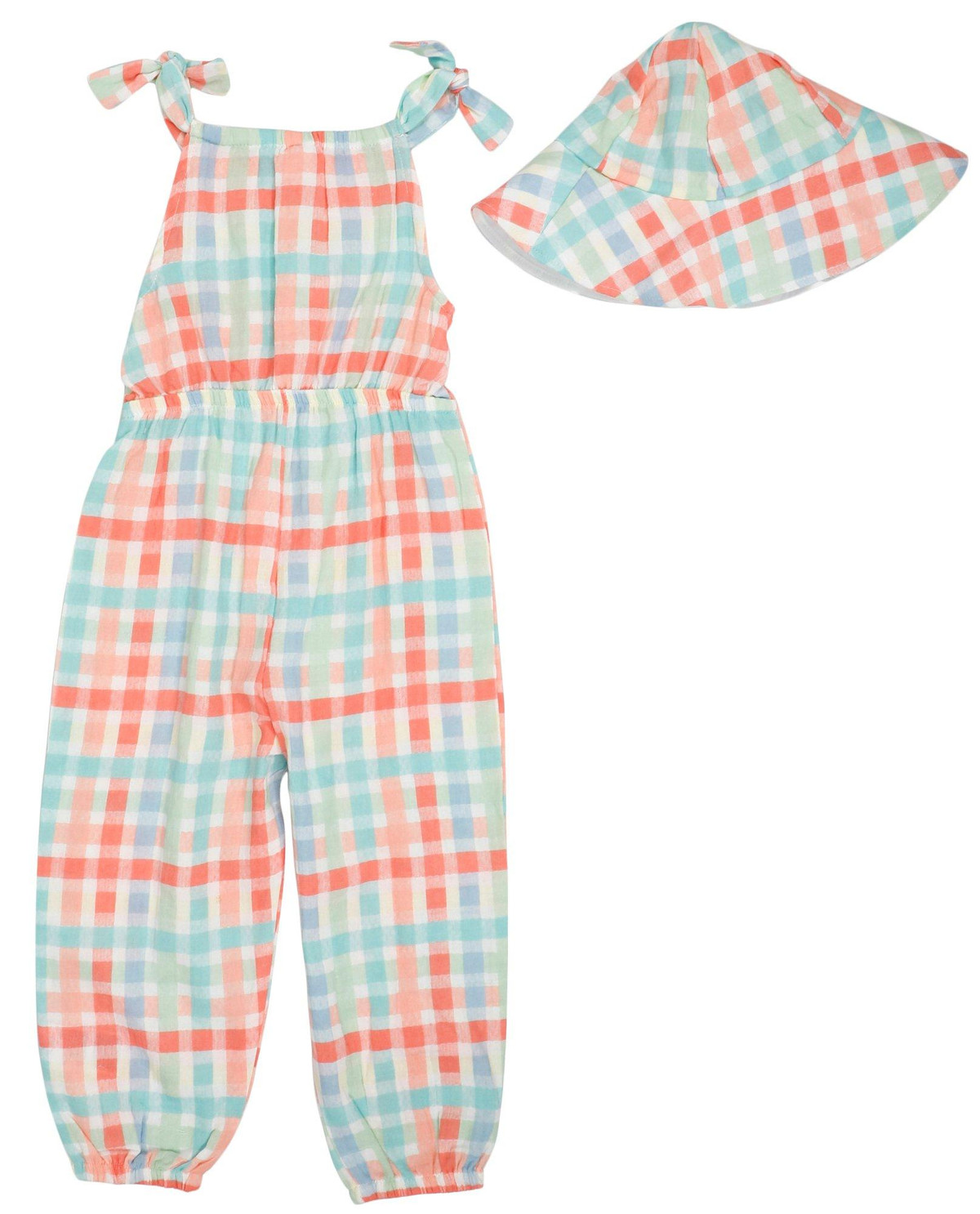 Your little one will look adorable in this 2-pc romper set. It features a colorfuls plaid design , an elastic waist, and a cute hat.