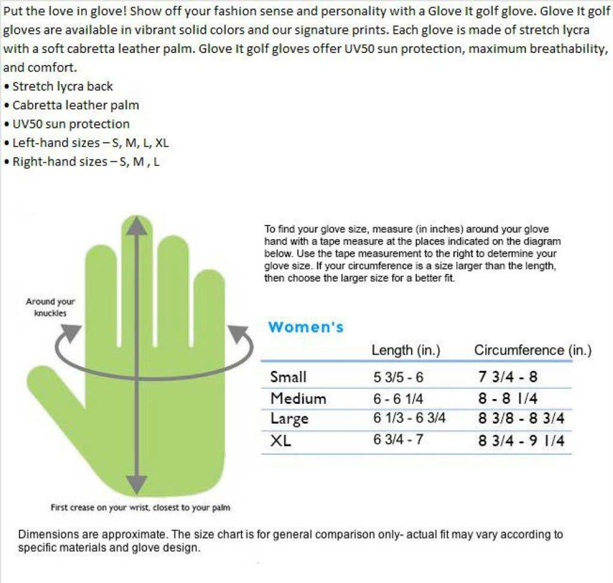 Put the love in glove! Show off your fashion sense and personality with the Island Breeze Glove It golf glove. Glove It golf gloves are available in vibrant solid colors and our signature prints. Each glove is made of stretch lycra with a soft cabretta leather palm. Glove It golf gloves offer UV50 sun protection, maximum breathability, and comfort.