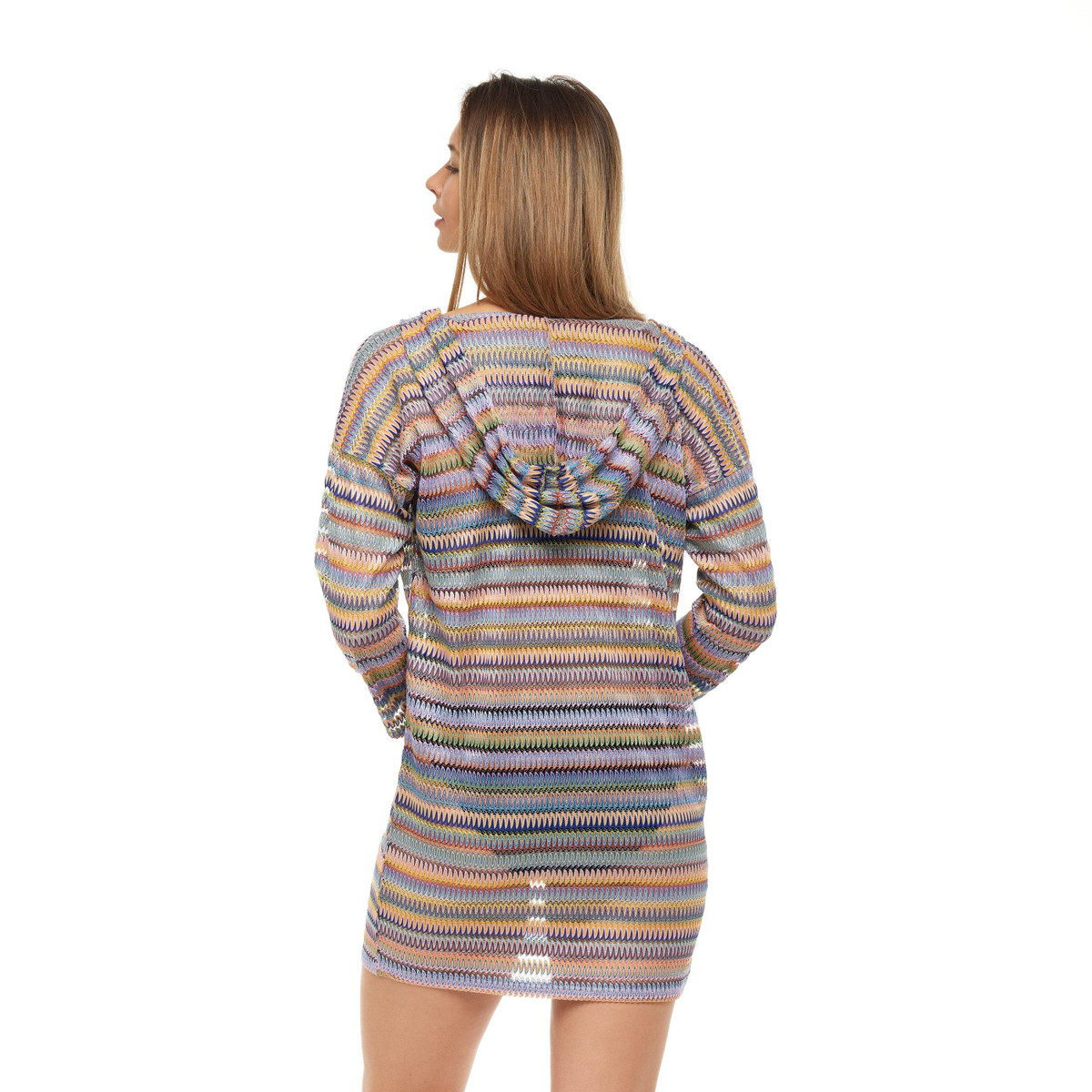 Embrace vibrant elegance with this rainbow long sleeve hoodie cover-up dress. Crafted from luxurious Bohemian Nights fabric, it features a touch of metallic for added flair. Perfect for poolside lounging, resort stays, or beach outings, this cover up combines comfort with a chic, bohemian style. Elevate your sunny adventures with this stylish and sophisticated cover up.