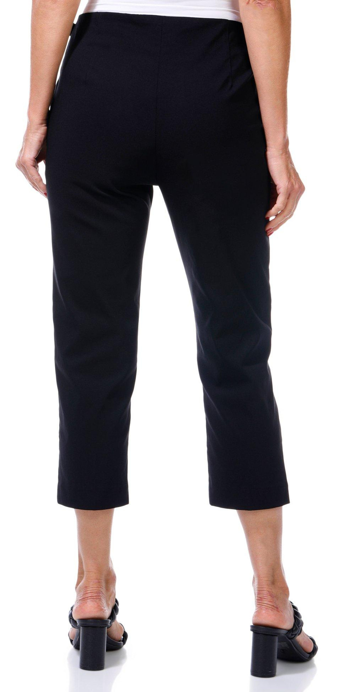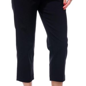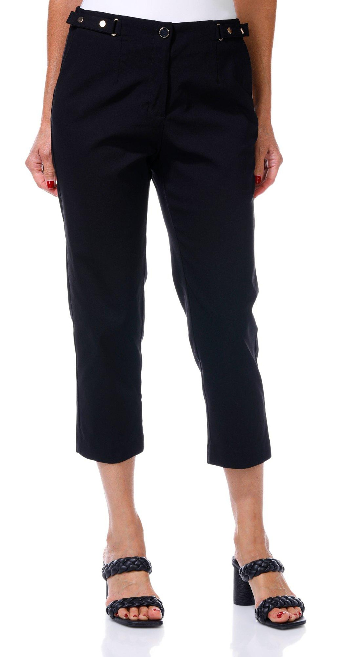 Step into stylish comfort with these Slim Crop. Designed with a flattering cropped length, these pants elevate any casual look. The gold button waist trim adds a refined touch of elegance. Inseam measures approximately 22 in. With 2 functional front pockets. Fabrication is 76% rayon, 21% nylon, and 3% spandex with trim made from 100% cotton.