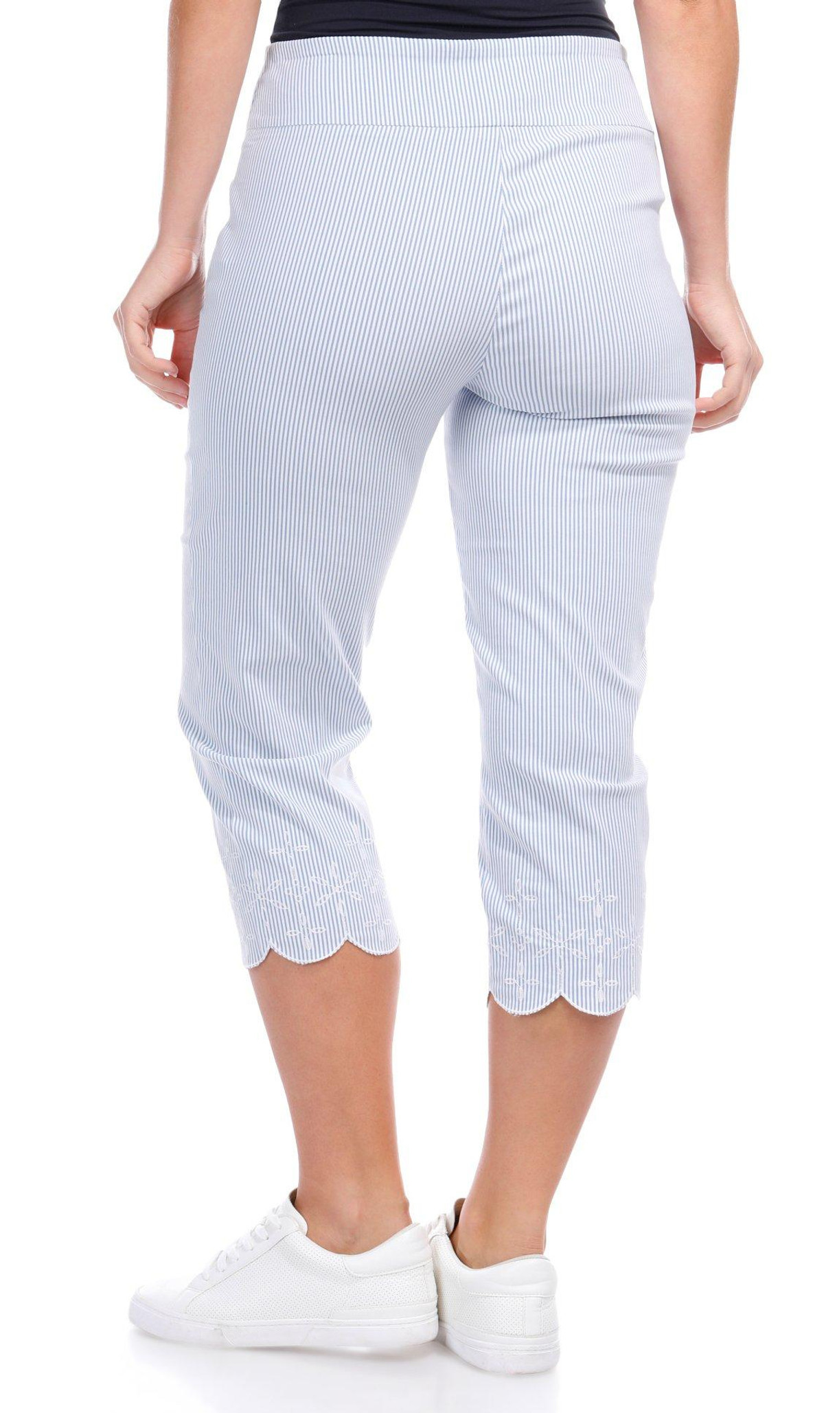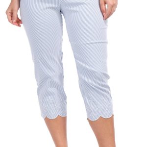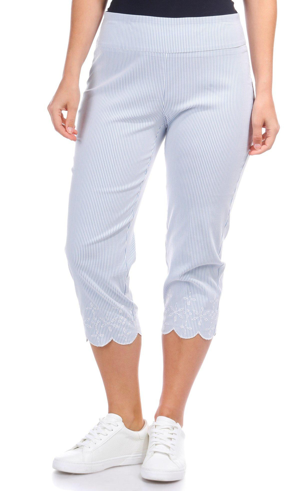 These womens capris feature a striped print with a 22 inch inseam and slim fit for a flattering silhouette. Made of nylon rayon and spandex they offer stretch and ease with a pull on waistband for all day comfort and style.
