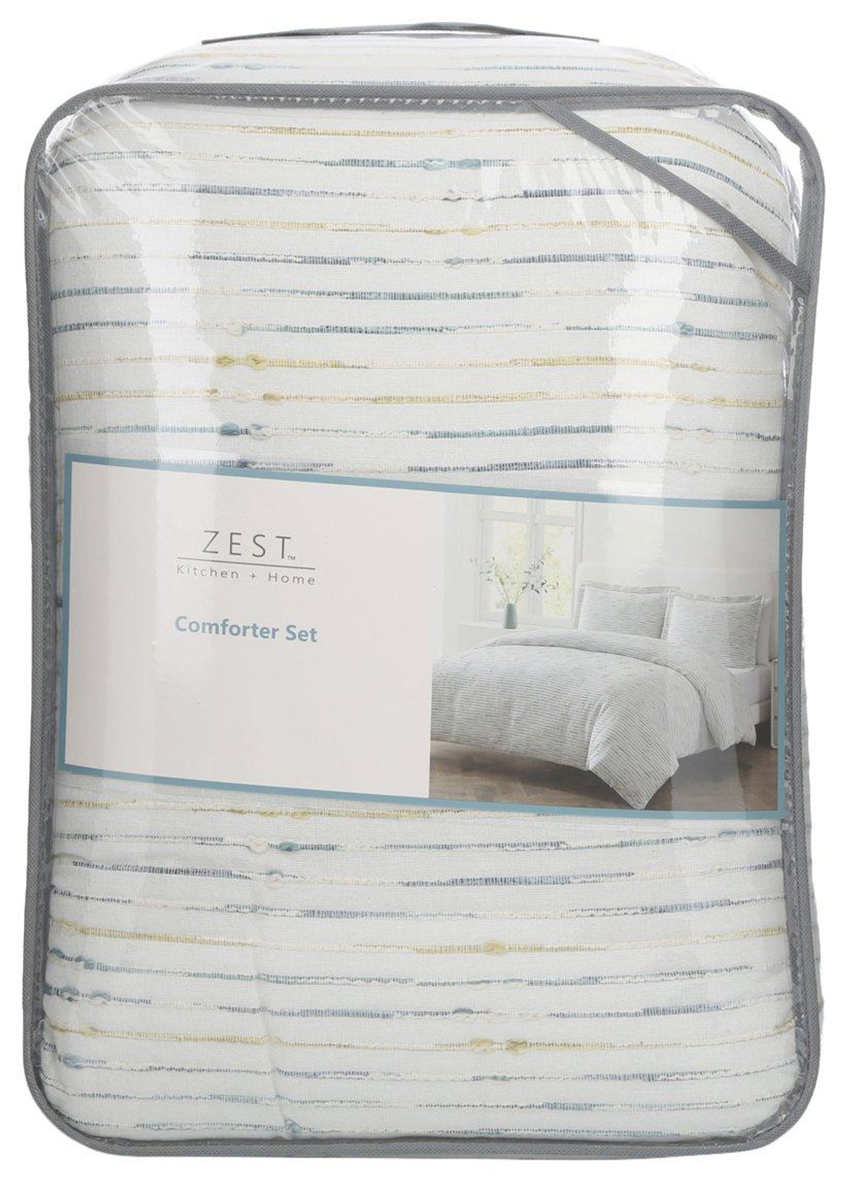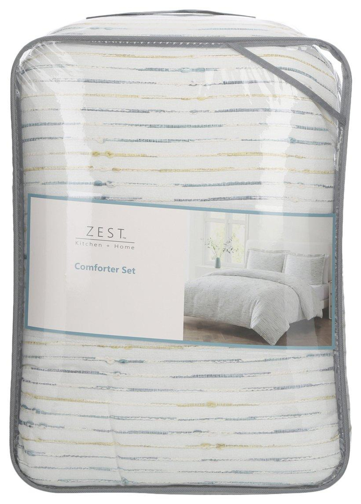 ZEST Kitchen+ Home is designed to help you celebrate life every day. Our passion for quality embodies every product, providing timeless style with a modern touch. Only available at Bealls Florida! This comforter set features a light striped design with embroidered details, 1 standard size comforter (full measurements for each size in traits) and two shams (1 included with the twin set.) Fabrication is cotton and polyester. Certified STANDARD 100 by OEKO-TEX.